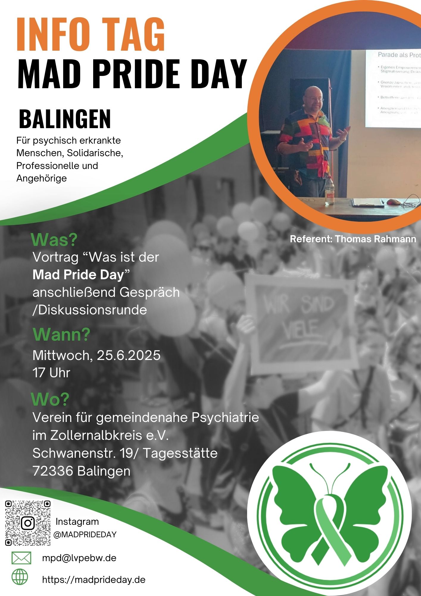 Am 25.Juni 2025 um 17 Uhr gibt es in der Tagesstätte des Verein für gemeindenahe Psychiatrie im Zollernalbkreis e.V. (Schwanenstr. 19, 72336 Balingen) eine Info-Veranstaltung mit Gespräch zum Mad Pride Day. Der Mad Pride Day wird dieses Jahr im Herbst in Stuttgart und damit zum allerersten Mal in Süddeutschland stattfinden. Organisator ist der Landesverband Psychiatrie-Erfahrener Baden-Württemberg.