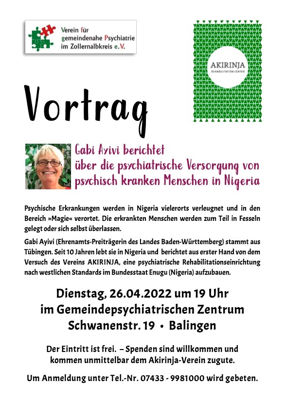 Am 26.04.2022 hielt Frau Gabi Ayivi (Ehrenamts-Preisträgerin des Landes Baden-Württemberg) einen interessanten Vortrag im Gemeindepsychiatrischem Zentrum über den Versuch des Vereins Akirinja, eine Rehabilitationseinrichtung nach westlichen Standards im Bundesstaat Enugu aufzubauen. Frau Ayivi lebt seit acht Jahren in Nigeria und konnte somit aus erster Hand über die Zustände vor Ort Auskunft geben.